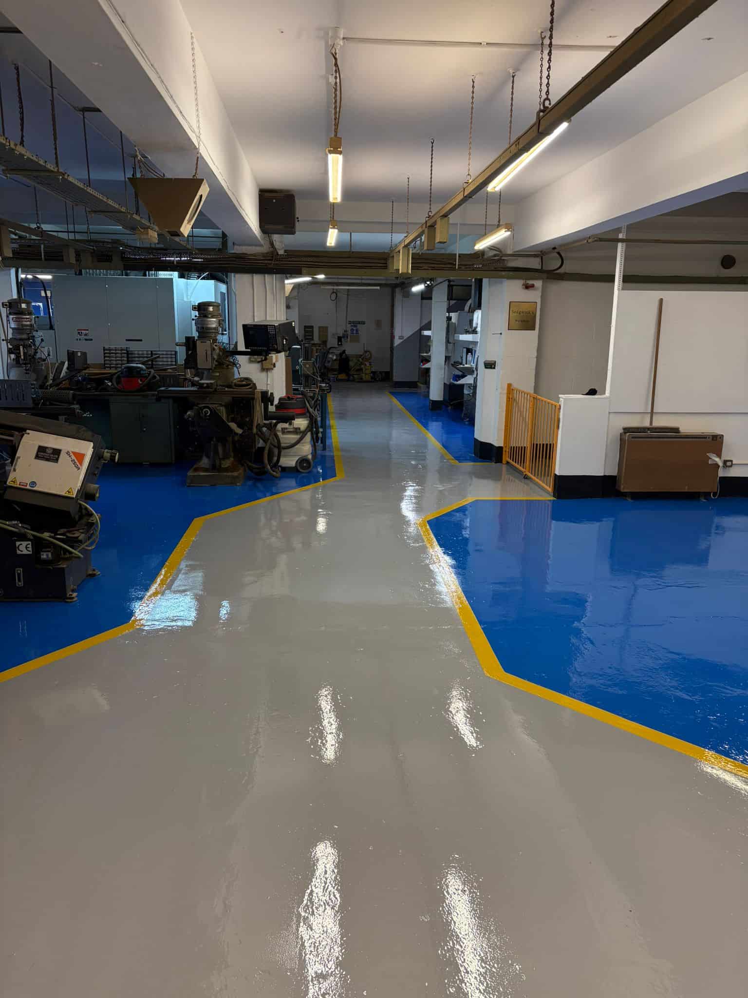 Finished high build epoxy resin flooring in the West Midlands showing blue and grey zones with yellow lines.
